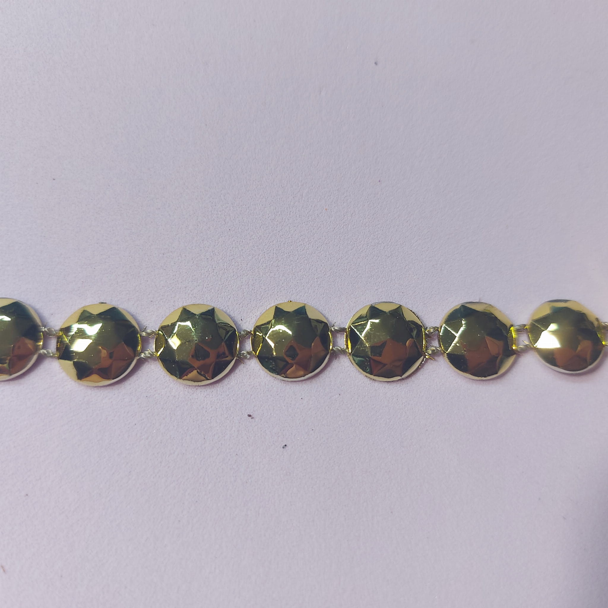 Piękna ozdobna taśma składająca się wielokątnych złotych półkryształków wielkości 1,2cm łączonych dwoma cienkimi sznureczkami w tym samym kolorze.